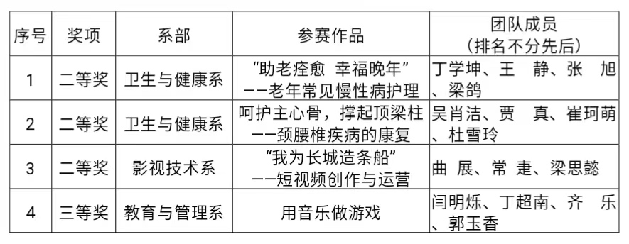 此次大赛学院高度重视、系统谋划、加强设计、全面保障,各部门通力协作,各教学系部根据比赛方案的要求,积极组织教师备赛参赛。经学院选拔,共上报4组作品参与市级竞赛。经过激烈角逐,贝博官网四支参赛队获奖。