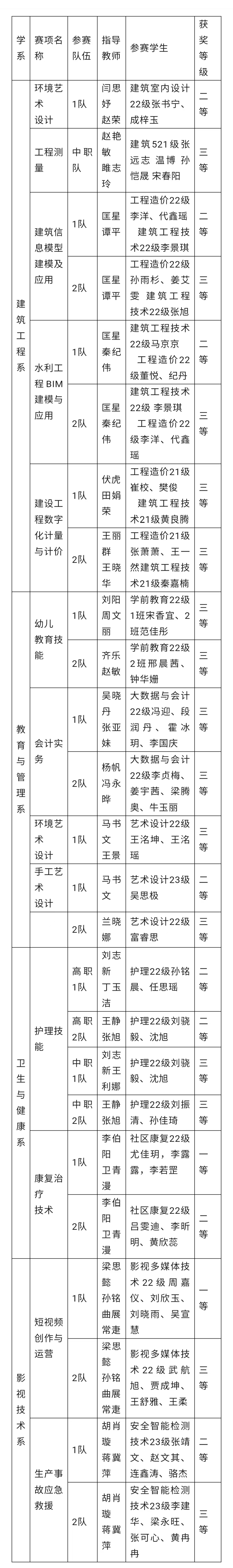 学院教育与管理系、影视技术系、建筑工程系、卫生与健康系四个系参加了北京市职业院校技能大赛环境艺术设计、建筑信息模型建模及应用、水利工程BIM建模与应用、建筑工程数字化计量与计价、幼儿教育技能、会计实务、手工艺术设计、护理技能、康复治疗技术、生产事故应急救援、短视频创作与运营共11个高职赛项和工程测量、护理技能共2个中职赛项,目前已经顺利完成比赛。