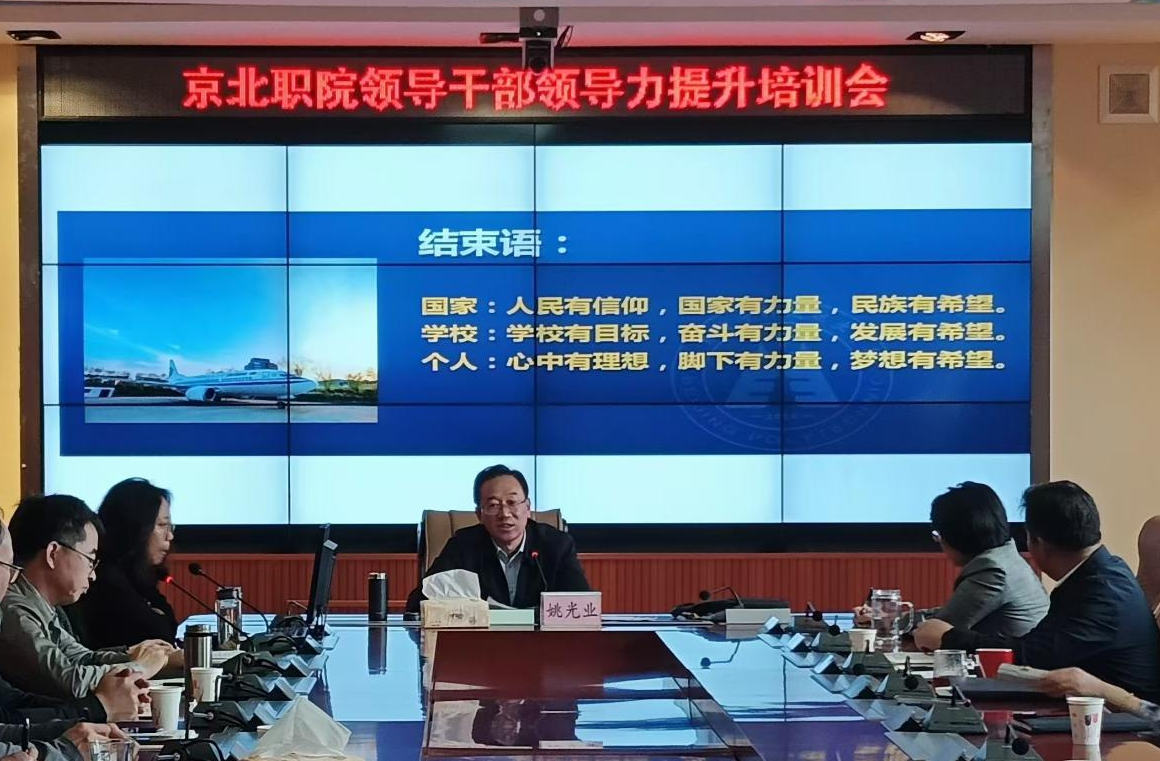 学院邀请到了原北京电子科技职业学院党委副书记、院长姚光业教授为干部们授课。培训内容主要有三个部分,首先,在领导力理论基础部分,姚教授介绍了领导科学、管理科学和领导力理论。其次,在学校领导力提升部分,强调要强化理论武装,增强战略思维,树立法治思维,胸怀世界眼光,把握发展大势,增强斗争本领,提升执行能力。最后,在有效的学校管理者部分,提出要做好自我管理,进行科学决策、高效治理,展现人格魅力。