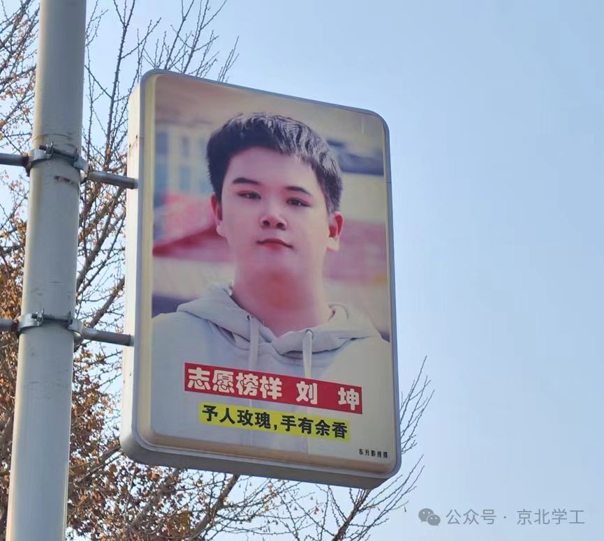 2023年5月,刘坤获“校园模范榜样——志愿榜样”称号,照片悬挂于校园文化灯箱。