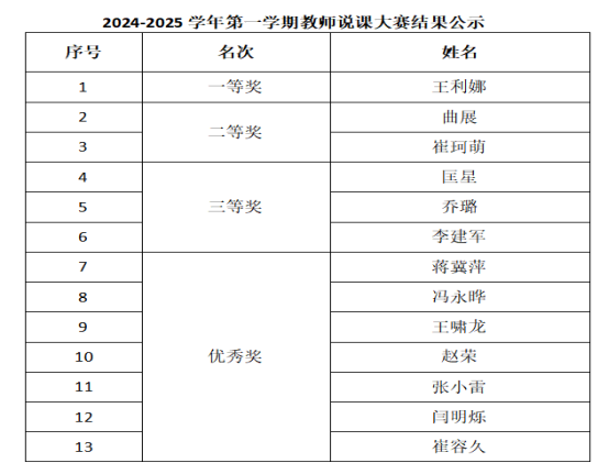 本次教师说课大赛既是对教师教学能力及课程把控力的考查,也是他们展示自身素养的好机会,更是一次教学思想的交流与碰撞。评委们认真评比了每一位参赛教师的课程设计,并从教学目标、教学重难点、教学过程、现场展示等方面进行了全面、客观的判分。经过激烈的角逐,最终评选出了一、二、三等奖和优秀奖若干名。