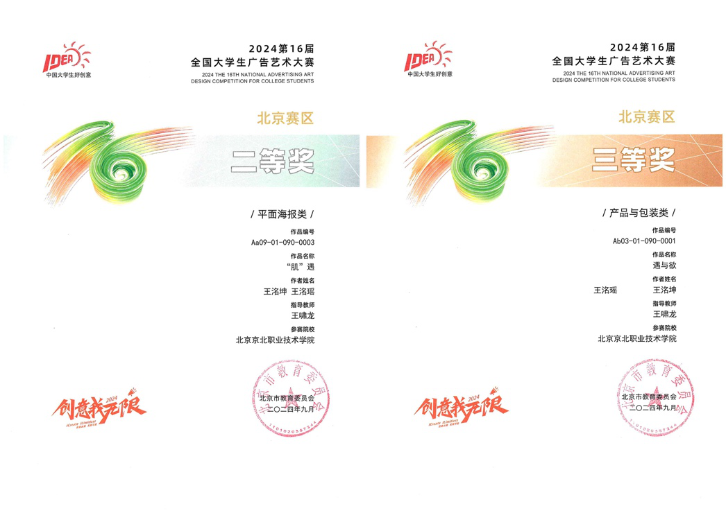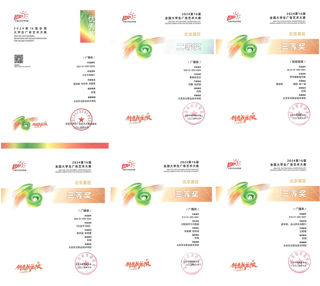 其中影视技术系,影视多媒体技术专业获得全国优秀奖1项,北京赛区二等奖2项,三等奖4项;教育与管理系,艺术设计专业荣获北京赛区获得二等奖1项,三等奖1项。这些荣誉不仅是对学生创意与技能的肯定,更是学院“以赛促学、以赛促教”教育理念的成功实践。