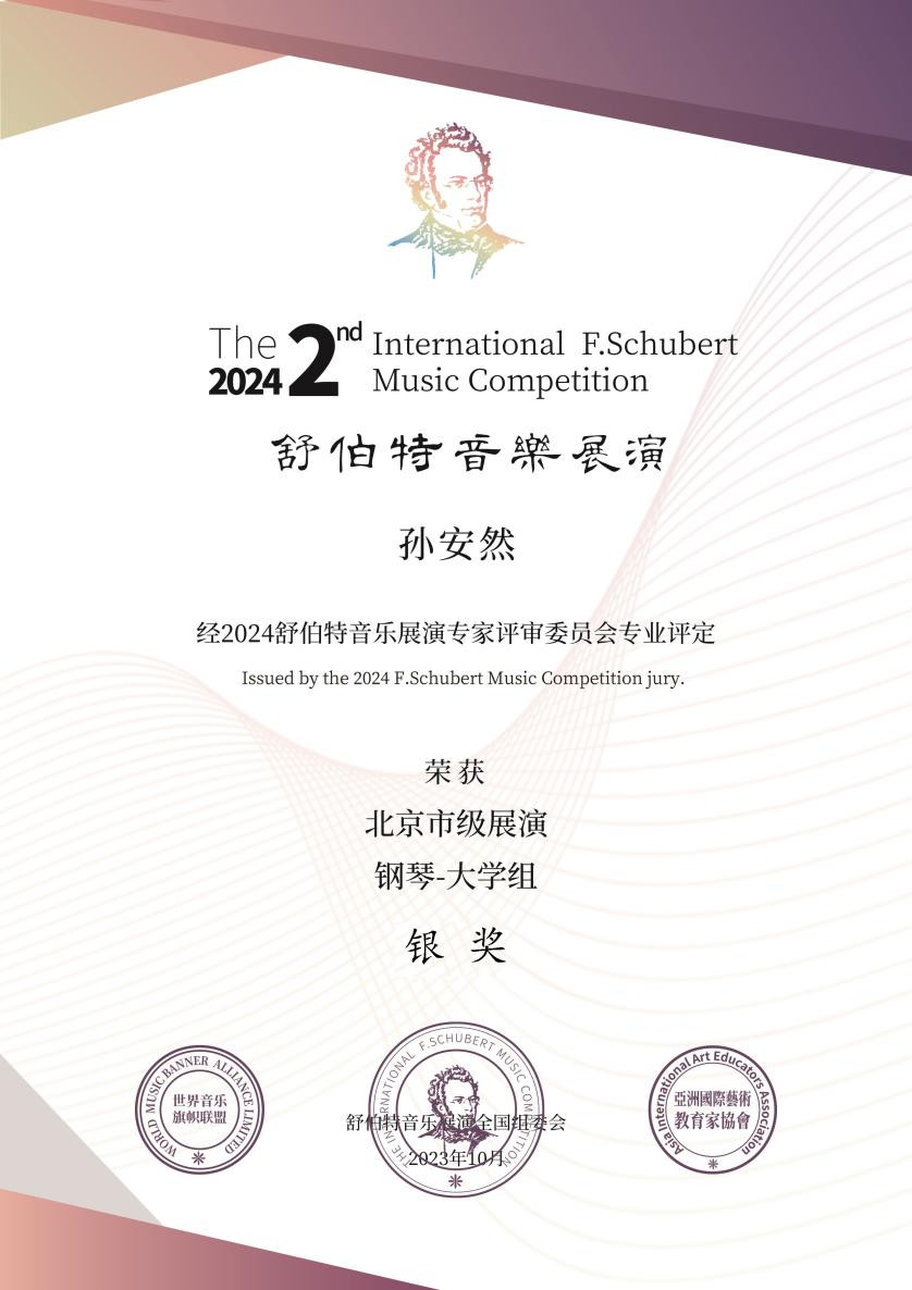 舒伯特音乐展演(The International F·Schubert Music Competition)为弘扬F·舒伯特在音乐创作和艺术教育领域的成就,由世界音乐旗帜联盟发起举办,亚洲国际艺术教育家协会协办,面向世界各地青少年音乐家、音乐爱好者开放报名。大赛组委会由艺术领域中极具权威性和经验丰富的专家们组成,赛事举办以来吸引了全球的音乐爱好者、专业演奏家及团队参加比赛。学前教育专业刘阳老师指导学前22级、23级学生将专业技能与展演比赛相结合,经过刻苦训练最终取得优异成绩。