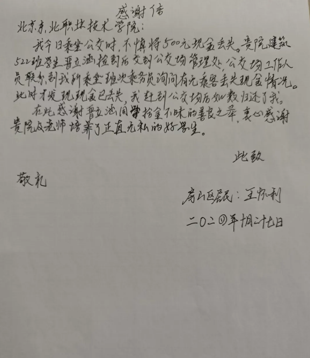 10月27号,贝博官网建筑工程系522级1班晋立涵同学乘坐公交车时,捡到了500元现金,立即交到了公交公司管理处。公交公司很快找到了失主,将钱归还了失主。失主非常感激,写来了表扬信。