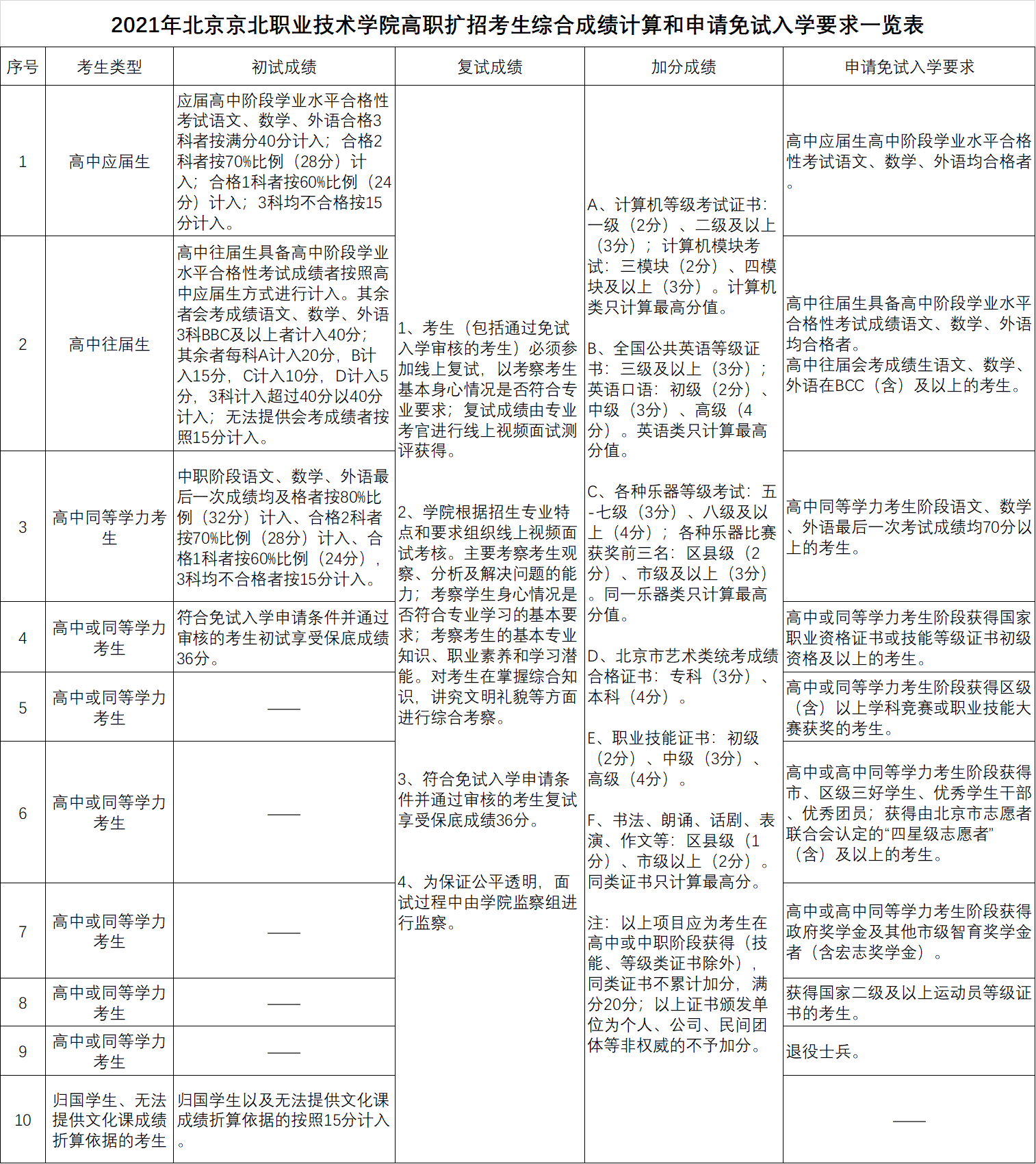 初试成绩、复试成绩、加分成绩计算及免试入学申请条件详见“2021年贝博艾弗森代言体育官网高职扩招考生综合成绩计算和免试入学申请要求一览表”。